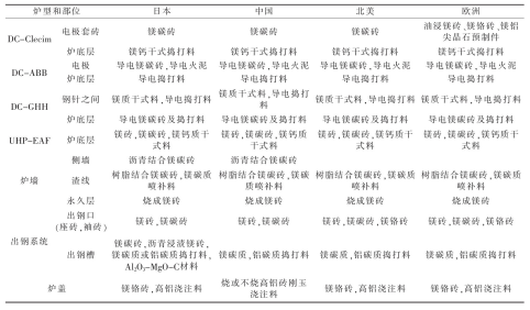 摘 要:由三根電極的普通交流電弧爐發(fā)展為超高功率(UHP)及一根電極的直流(DC)電弧爐,爐體結(jié)構(gòu)有一些改變。針對各部位的損毀因素,內(nèi)襯用的耐火材料也有所發(fā)展。例如普通電弧爐的爐頂用高鋁磚、爐墻鎂磚砌筑,而UHP及DC電弧爐采用大面積水冷爐頂、爐墻,爐頂三角區(qū)采用剛玉澆注料或預(yù)制件,爐墻用鎂碳磚,蝕損嚴(yán)重部位采用噴補作業(yè)。還介紹了日本等一些國家DC和UHP的各種爐型用耐火材料。煉鋼電弧爐是以電極端部和爐料之間發(fā)生的電弧為熱能進(jìn)行煉鋼的設(shè)備。電弧爐以廢鋼為爐料直接煉鋼,與礦石煉鐵后再煉鋼相比,基建投資少,節(jié)能60%、節(jié)水40%、減少廢氣排放86%、減少廢渣97%[1]。交流電弧爐歷史悠久,交流電是通過三根石墨電極輸入爐內(nèi),在電極下端與金屬料之間產(chǎn)生電弧,利用電弧高溫直接加熱爐料,使煉鋼過程得以進(jìn)行。供電功率越高,爐料熔化速度越快,降低能量消耗越多,因此出現(xiàn)超高功率(UHP)電弧爐。在超高功率的基礎(chǔ)上發(fā)展了直流(DC)電弧爐煉鋼。直流電弧爐是以一根石墨電極的端點為陰極,爐底為陽極,石墨電極位于爐膛中心部位。與UHP相比設(shè)備結(jié)構(gòu)簡單,建設(shè)費用低,熔池中的電流與熱量分布比較均勻,不存在過熱區(qū)域,因此耐火材料損耗比較小、節(jié)能且噪音小等。目前,煉鋼電弧爐向大型化、控制自動化方向發(fā)展。我國的電弧爐主要用來生產(chǎn)合金鋼。煉鋼水平與工業(yè)發(fā)達(dá)國家相比差距較大,如2015年我國電爐鋼占粗鋼總產(chǎn)量的6.1%,2020年有所提高,但也不超過10%,與世界平均水平的30%相比還有較大差距。我國已經(jīng)引進(jìn)先進(jìn)水平的UHP和DC電弧爐,隨著經(jīng)濟(jì)發(fā)展,工業(yè)化程度提高,必然伴以廢鋼資源數(shù)量增加,同時發(fā)展鐵礦石直接還原煉鐵技術(shù),代替廢鋼,增加電弧爐煉鋼的爐料,還有核電的發(fā)展,使電弧爐煉鋼有了物質(zhì)保證。電弧爐的內(nèi)襯是耐火材料構(gòu)成的,隨著UHP和DC技術(shù)的發(fā)展,需要新型優(yōu)質(zhì)耐火材料與之相配套。有人說[2]:沒有優(yōu)質(zhì)爐襯、爐底耐火材料支持長壽爐齡,超高功率電弧爐就無法發(fā)揮高效生產(chǎn)的優(yōu)勢。爐底耐火材料是直流電弧爐得以實現(xiàn)的必要條件,反映了煉鋼與耐火材料技術(shù)的互相影響,互為依存,在電弧爐煉鋼系統(tǒng)優(yōu)化生產(chǎn)中有不可分割的作用。1 電弧爐的結(jié)構(gòu)變化傳統(tǒng)的電弧爐由爐頂(又稱爐蓋)、爐墻、爐坡、爐底和出鋼槽構(gòu)成,全部用耐火材料構(gòu)筑,外包鋼制爐殼。爐墻一側(cè)設(shè)有爐門,另一側(cè)為出鋼口,并與出鋼槽相連。而UHP和DC電弧爐采用偏心爐底出鋼,使?fàn)t體由傾動式改為固定式,爐底有供氣攪拌設(shè)置,爐頂安裝氧-燃料燒嘴,在爐底偏心位置設(shè)置出鋼口,代替出鋼槽。由于取消了傾動設(shè)備,擴(kuò)大了水冷面積,緩和了爐襯的損毀,適當(dāng)降低了出鋼溫度,并縮短了出鋼時間,從而降低生產(chǎn)成本。爐墻采用鑲砌水冷箱式水冷套措施,其內(nèi)表面噴涂一層耐火涂料,使其掛渣形成保護(hù)層,可有效降低耐火材料消耗,但電耗可能增加。國外有的電弧爐功率達(dá)1 000 kV·A/t以上,爐墻壽命達(dá)2 000爐次以上,水冷爐蓋壽命達(dá)4 000爐次,降低耐火材料消耗60%以上。2 耐火材料內(nèi)襯的損毀因素電弧爐內(nèi)襯的耐火材料長期處于高溫、熔渣侵蝕和急熱急冷狀態(tài)下,工作條件極其惡劣。在煉鋼的熔化期和氧化期,不致于因高溫?fù)p壞爐襯,但在還原期的鋼液溫度相當(dāng)高,又受電弧直接輻射(有時溫度達(dá)4 000℃以上),爐襯很容易造成熔融損壞。出完鋼裝料時,爐襯溫度突然下降,裝完料開始送電,溫度又逐漸升高,這種急冷急熱是爐襯剝落的直接原因,主要是爐頂容易剝落。耐火材料內(nèi)襯損毀的主要因素包括[3]:(1)化學(xué)侵蝕。FeO或渣中SiO2與耐火材料中的CaO、MgO之間的化學(xué)反應(yīng),使?fàn)t襯變?yōu)槿墼鴮?dǎo)致?lián)p毀。(2)耐火材料內(nèi)襯中的碳成分被含氧成分(如FeO、O2、MgO等)氧化,導(dǎo)致耐火材料脫碳而損毀。(3)沖刷和機械沖擊。鋼水或熔渣流過耐火材料表面,以物理性磨損或沖刷爐襯,而導(dǎo)致內(nèi)襯損毀;在出鋼口、渣線、電極口或排氣口平臺等沖刷嚴(yán)重,廢鋼等爐料吊入往往撞擊爐襯而損毀。(4)水化。在生產(chǎn)過程中,往往會出現(xiàn)爐頂或爐墻漏水或滲水,還有水蒸氣,與堿性耐火材料中的MgO、CaO進(jìn)行水化反應(yīng),使內(nèi)襯損毀。3 電弧爐用耐火材料根據(jù)電弧爐的結(jié)構(gòu),由于各部位承受的熱負(fù)荷大小不同,與熔渣、鋼水接觸作用及機械損壞程度存在差異,不同部位必須采用不同的耐火材料[4]。3.1 爐頂(蓋)我國中小電弧爐普遍采用燒成或不燒高鋁磚,局部用高鋁質(zhì)或剛玉質(zhì)不定形耐火材料預(yù)制件。大型超高功率電弧爐和直流電弧爐采用水冷技術(shù),除三角區(qū)外,爐頂耐火材料不是關(guān)鍵。三角區(qū)由于強烈熱震及電極熱輻射苛刻,國外普遍采用剛玉質(zhì)或鋁鉻質(zhì)搗打料,我國一般用高鋁質(zhì)或剛玉質(zhì)搗打料。天津鋼管集團(tuán)公司150 t超高功率電弧爐,爐頂三角部分(三個電極孔周圍)采用鉻剛玉質(zhì)澆